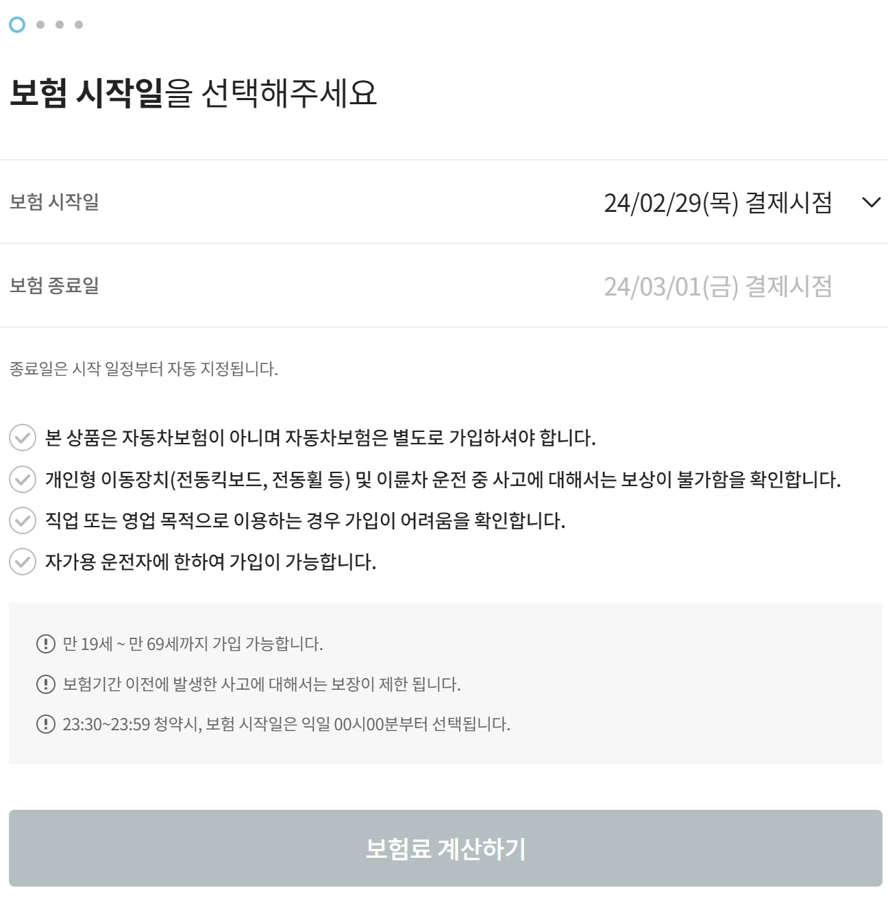 우선 보험 시작일 선택 및 보험 종료일 선택 후 보험료 계산하기를 클릭합니다.