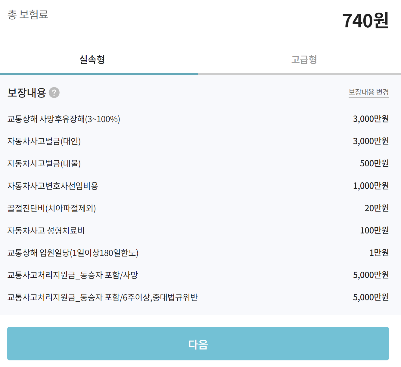 생년월일 입력 후 다음을 누르면 다음과 같이 보험료가 계산됩니다.