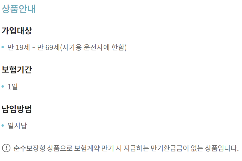 - 원데이운전자 보험은 **외제차나 법인차**에는 가입이 불가능합니다.