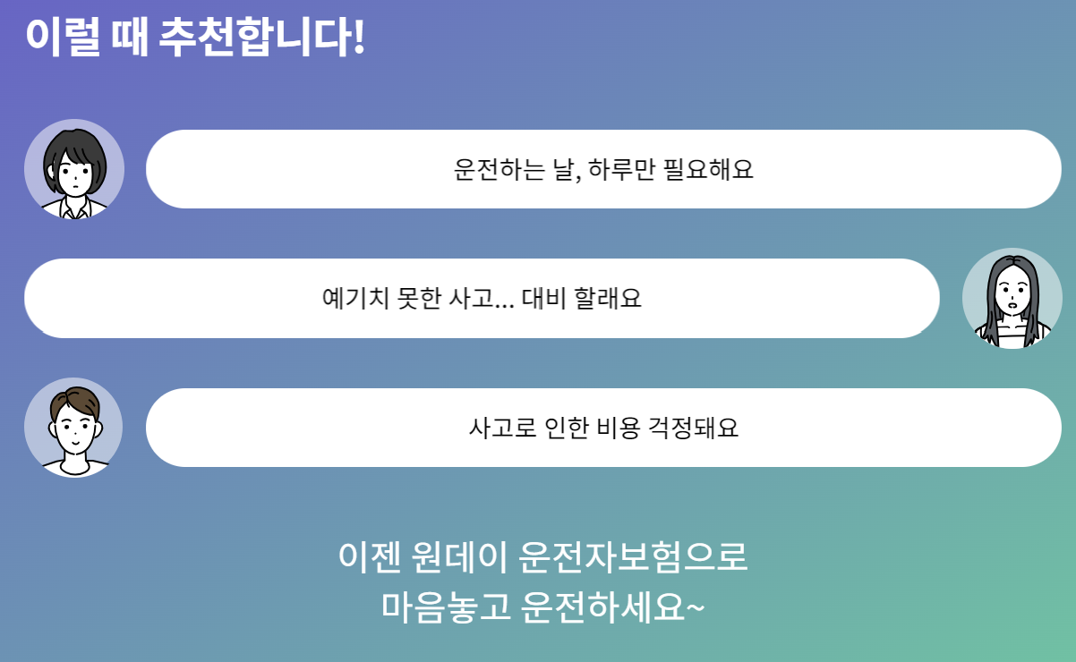 - 원데이운전자 보험은 **가입한 운전자만 운전**이 가능합니다. 다른 사람이 운전할 경우에는 보장이 되지 않습니다.