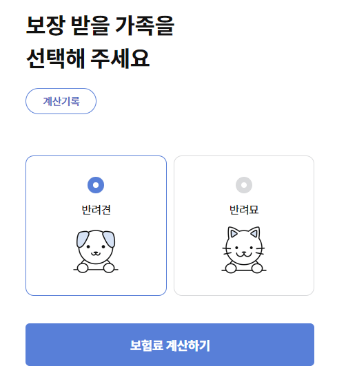 반려견, 반려묘 선택 후 보험료 계산하기를 클릭합니다.