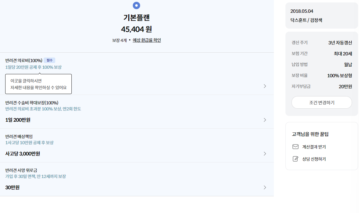 반려견 종류 입력을 완료하면 바로 다음과 같이 보험료가 계산됩니다.