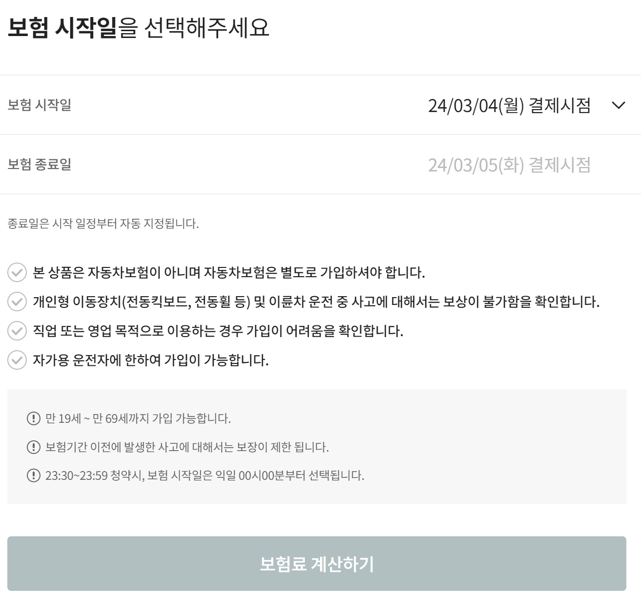 우선 보험시작일 및 체크사항 체크 후 보험료 계산하기를 클릭합니다.