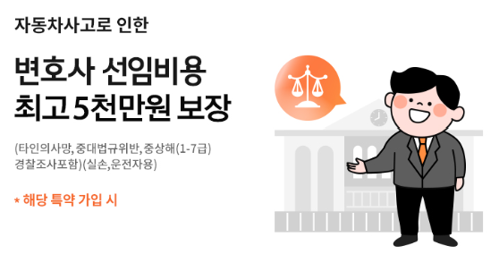 자동차사고변호사선임비용Ⅳ(보험가입금액 - 5,000만원)경찰조사포함,실손,운전자용자동차를 운전하던 중 사고로 타인의 신체에 상해를 입힘으로써 구속영장에 의하여 구속되었거나 검찰에 의하여 공소 제기(단, 약식기소는 제외)된 경우, 검사에 의해 약식기소 되었으나 법원에 의해 보통의 심판절차인 공판절차에 의해 재판이 진행하게 된 경우, 검사에 의해 약식기소 되었으나 형사소송법 제453조에 의거하여 검사 또는 피보험자가 법원의 약식명령에 대하여 정식재판을 청구하는 경우, 경찰조사 후 불송치된 경우 또는 검찰에 의해 약식기소 또는 불기소된 경우(단, 경찰조사 후 불송치된 경우 또는 검찰에 의해 약식기소 또는 불기소된 경우는 타인사망, "중대법규위반 교통사고"로 타인의 신체에 상해를 입힌 경우, “중대법규위반 교통사고”에 해당하지 않는 자동차사고로 타인의 신체에 상해를 입힘으로써 피해자에게 자동차사고 부상등급표에 정한 부상등급 1급, 2급 또는 3급에 해당하는 부상을 입힌 경우 또는 “중대법규위반 교통사고”에 해당하지 않는 자동차사고로 타인의 신체에 상해를 입힘으로써 피해자에게 자동차사고 부상등급표에 정한 부상등급 4급 내지 7급에 해당하는 부상을 입힌 경우(단, 경찰서 또는 검찰청에 제출된 의사 진단서 또는 소견서 상 중상해인 경우에 한함)에 한함)에 변호사선임비용을 부담함으로써 입은 손해를 보험가입금액 한도로 실손보상