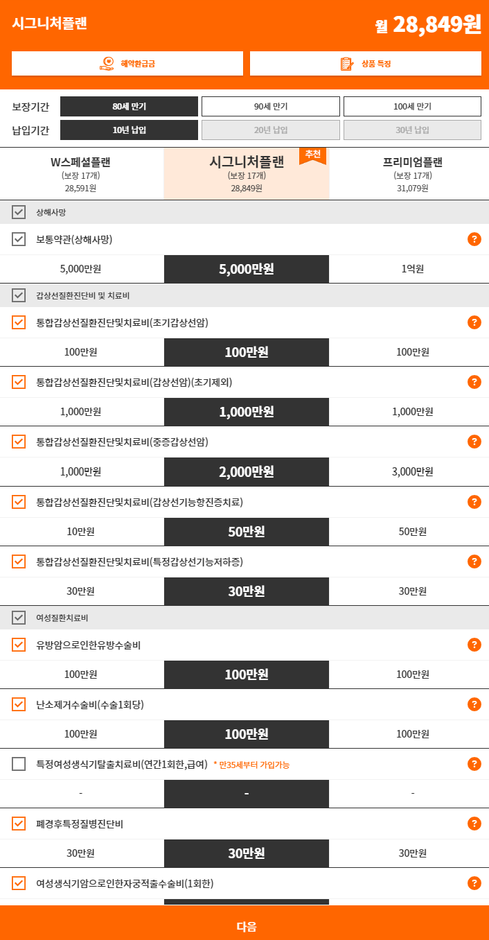 보험료는 보장기간, 납입기간, 플랜 등 여러 조건에 따라 달라지므로 직접 조회해보시기 바랍니다.