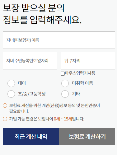보험료 계산방법은 간단합니다. 우선 자녀 정보를 입력하고 보험료 계산하기를 클릭합니다.