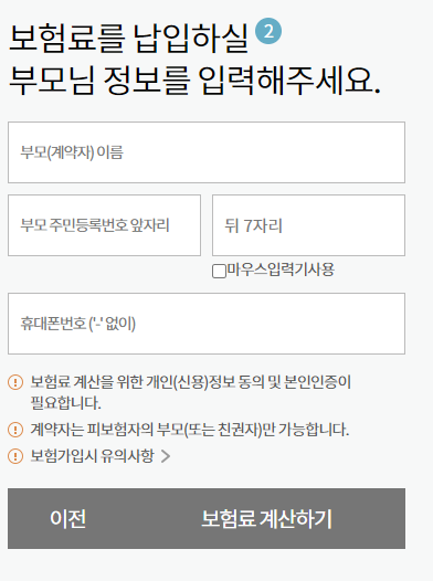부모 정보 입력 후 간단하게 보험료 계산할 수 있습니다.