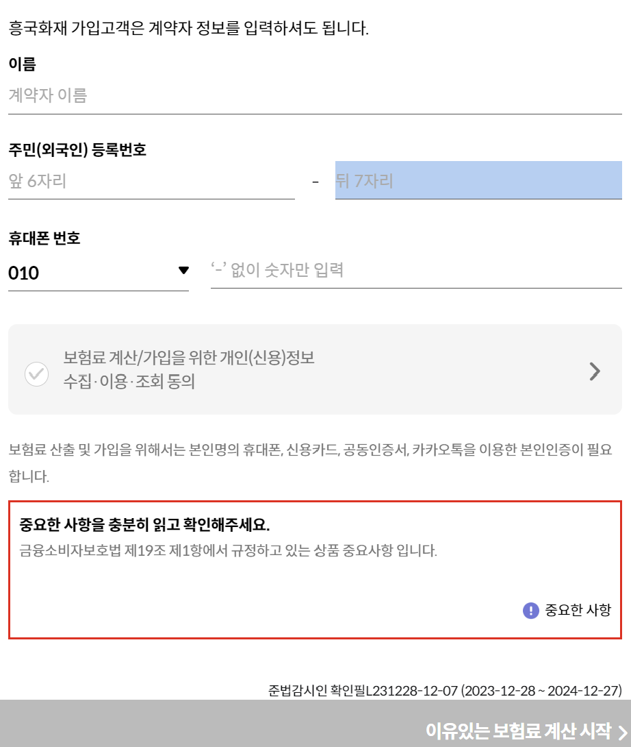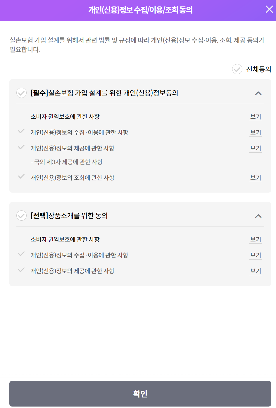 보험료 계산을 위한 개인정보 동의를 합니다.
