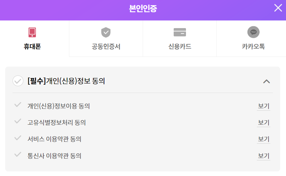 원하는 방법으로 본인인증을 진행합니다. 인증을 완료하면 아래와 같이 중복 가입한 지 확인이 가능합니다.