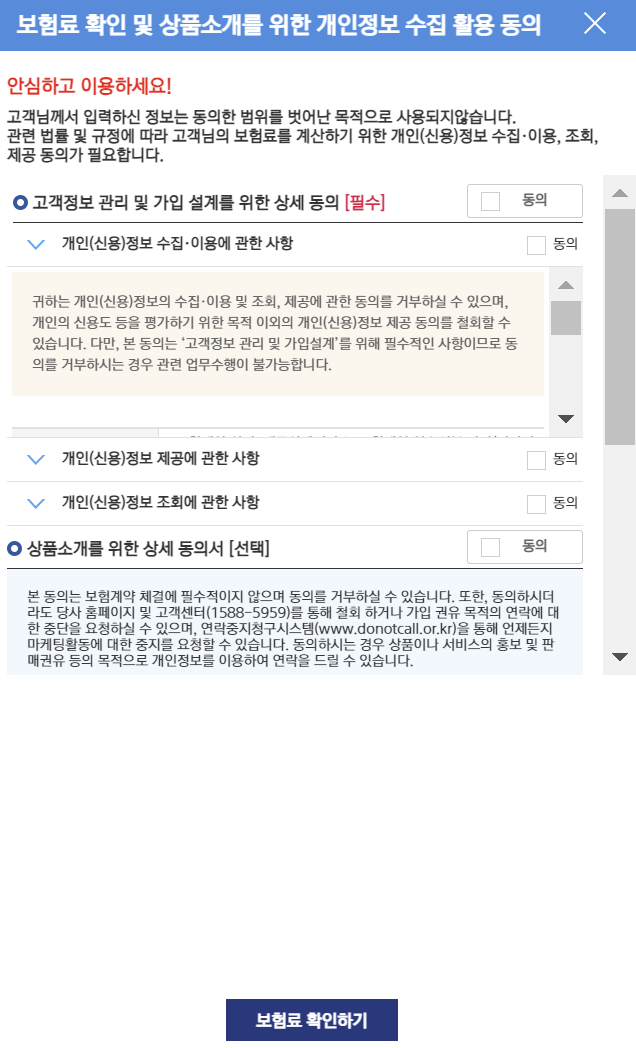 보험료 계산을 위한 개인정보 수집 이용에 동의 후 보험료 확인하기를 클릭하면 조회가 가능합니다.