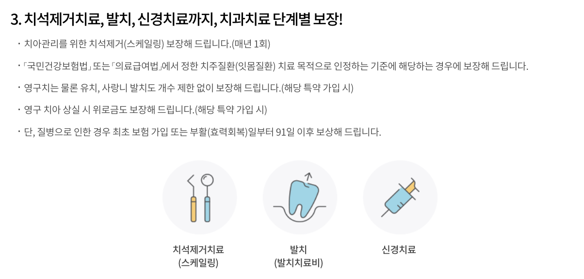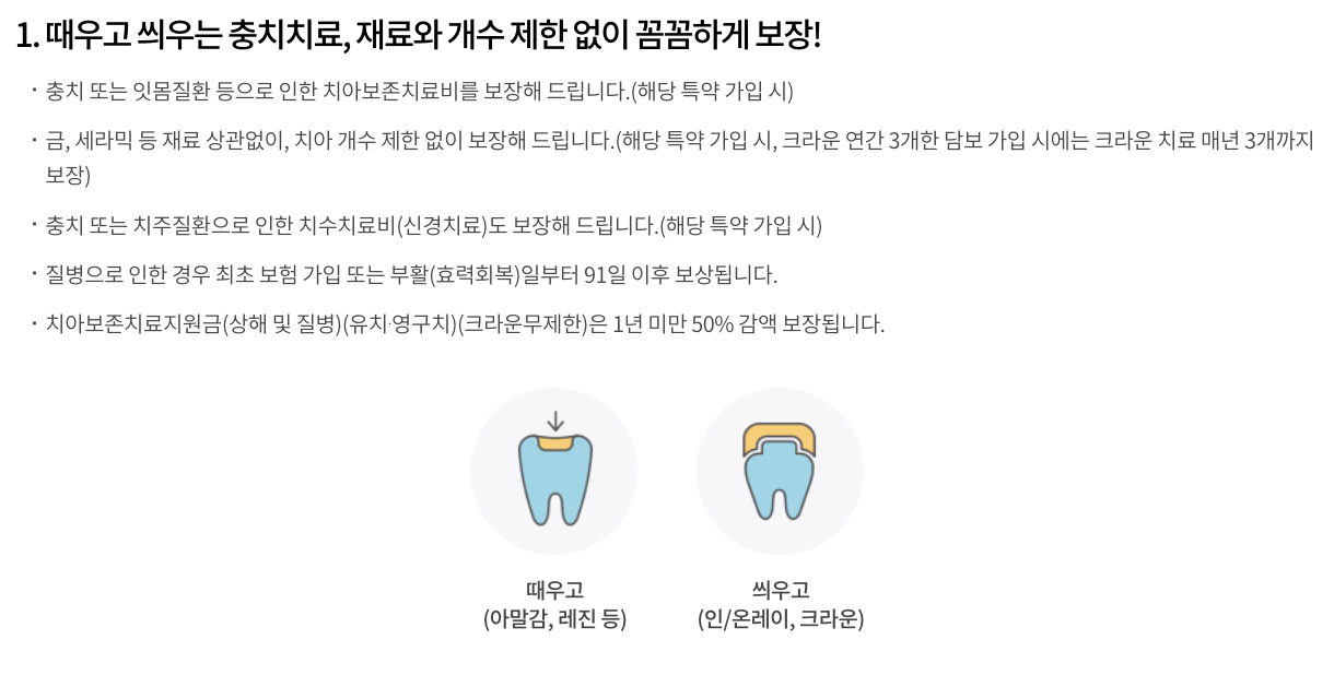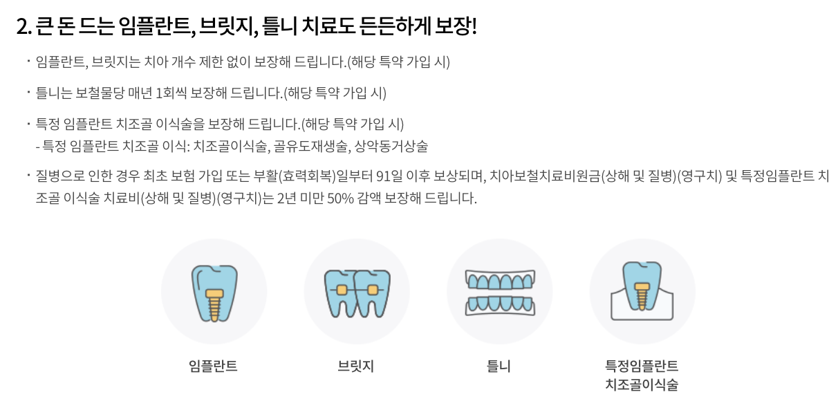 - 폭넓은 보장 범위: 임플란트, 브릿지, 틀니 등 고액 치료는 물론, 충치 치료, 크라운 치료, 스케일링까지 다양한 치과 치료를 보장합니다.