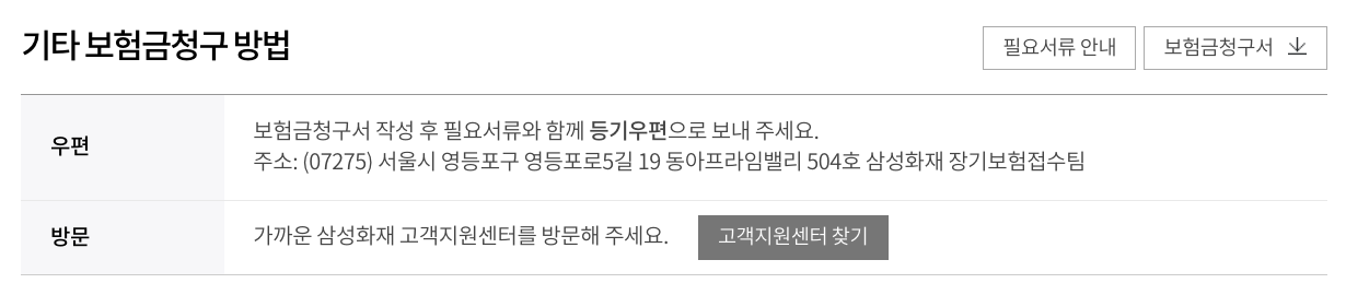 - 우편: 서울시 서초구 서초대로74길 11 삼성화재 서초타워 7층 보험금 서비스팀으로 필요 서류를 우편으로 발송하여 청구할 수 있습니다.