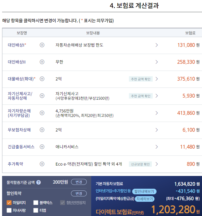 바로 보험료가 계산되며 보험료는 할인특약 적용 여부, 차종, 보장금액, 운전자 정보 등 다양한 조건에 따라 달라지므로 직접 조회해보시기 바랍니다.