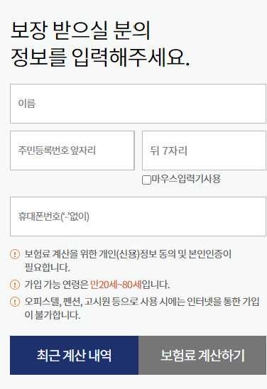 이름, 주민번호, 휴대폰 번호 입력 후 보험료 계산하기를 클릭합니다.