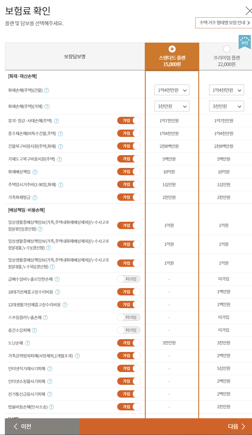 보험료는 플랜마다, 보장금액, 플랜 ,주택 정보 등 여러 조건에 따라 달라지므로 직접 조회해보면서 비교해보시기 바랍니다.
