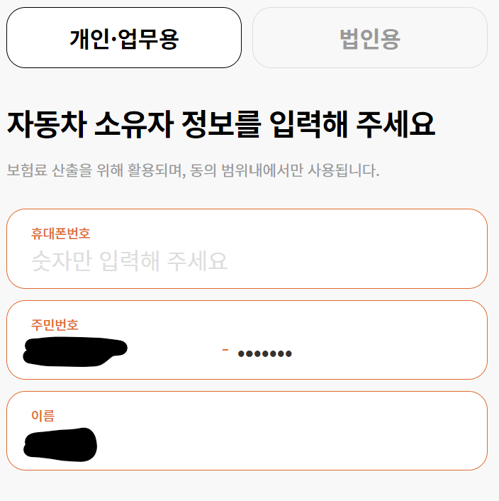 휴대폰번호, 주민번호, 이름 입력합니다.