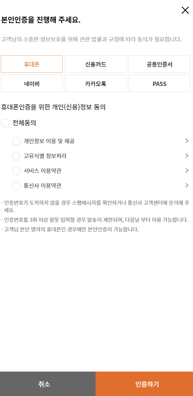 원하는 방식으로 본인인증을 진행합니다.