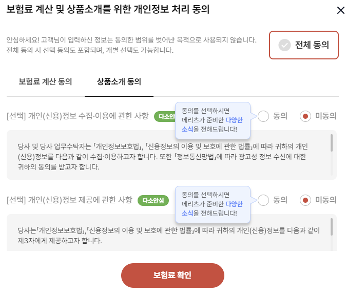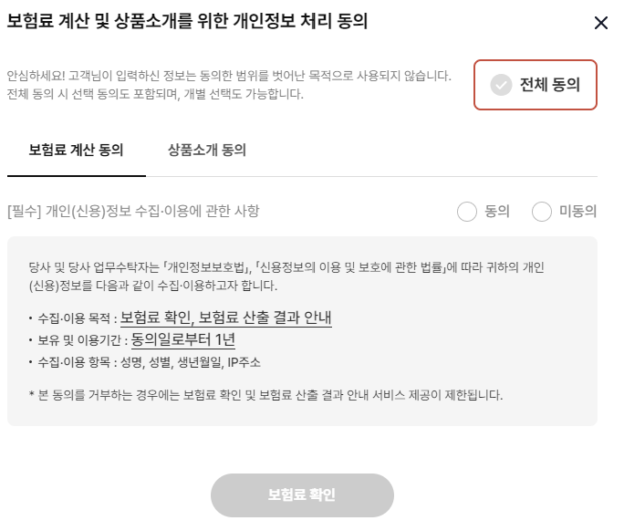 보험료 계산을 위한 필수 개인정보 수집 이용에 동의를 합니다.