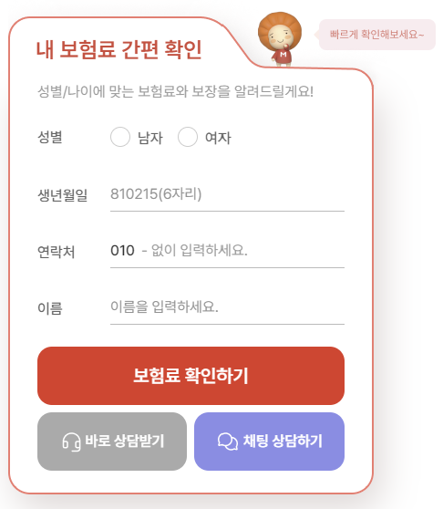 보험료 조회는 성별 등 개인 정보 입력 후 보험료 확인하기를 클릭합니다.