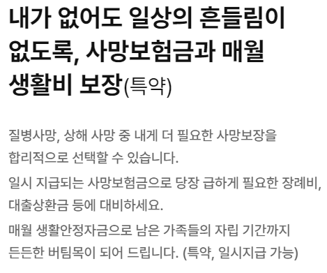 - 갱신형 질병사망 생활안정자금(2년) : 질병사망 생활안정자금 지급을 위한 보험금 지급사유 발생 해당일이 없을 때에는 보험금 지급 사유 발생 해당일이 속하는 달의 마지막 날에 지급합니다.