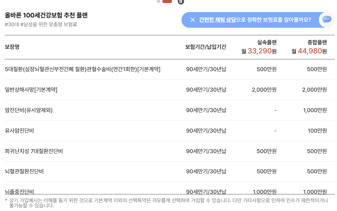 | 40세 | 남성 | 암 7천, 뇌/심장 각 5천, 만성질환 특약 포함 | 약 45,000원/월 |