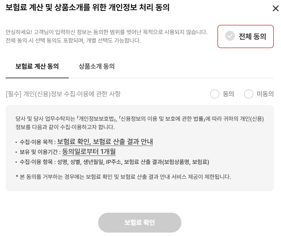 그럼 위 사진과 같이 나오는데 여기서 전체 동의 말고 보험료 계산만 동의해줍니다.