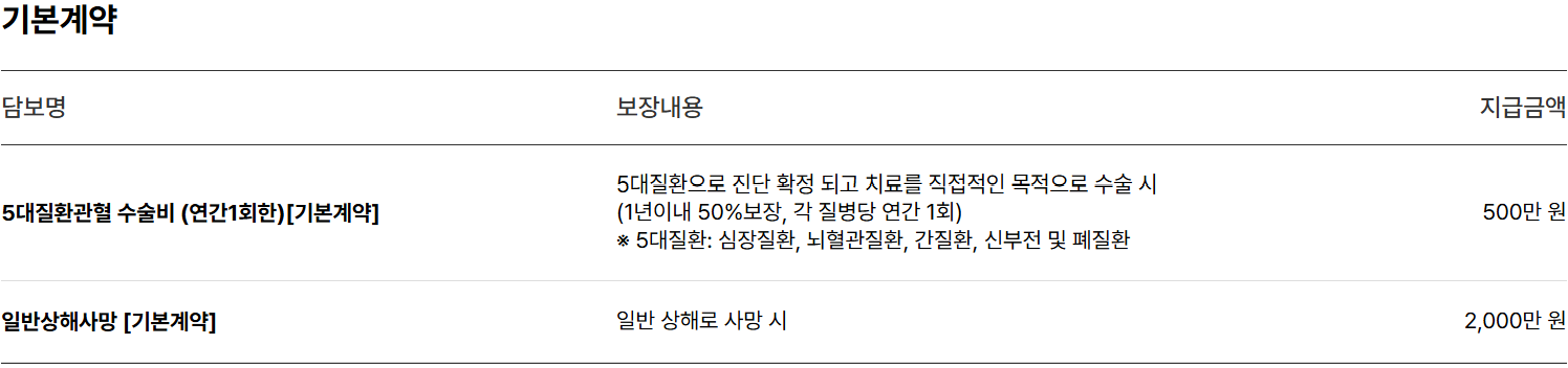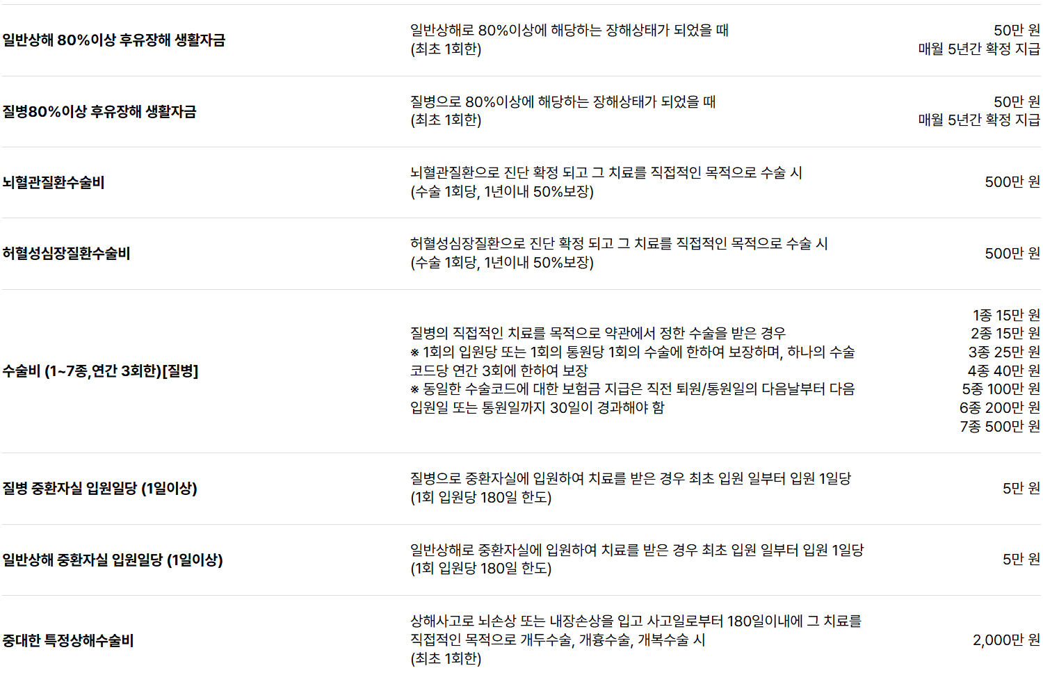 | 보장 범위 | 암, 뇌혈관, 심장질환, 수술, 입원, 정신질환 등 폭넓음 |
