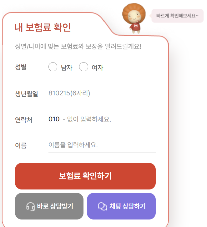 상품소개 동의하면 연락오니 계산만 동의하시고 보험료 확인을 클릭합니다.