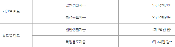 대출한도는 동일인 당 최대 1천 2백만원으로 기간별한도 , 용도별 한도는 아래와 같습니다.
