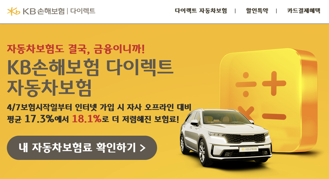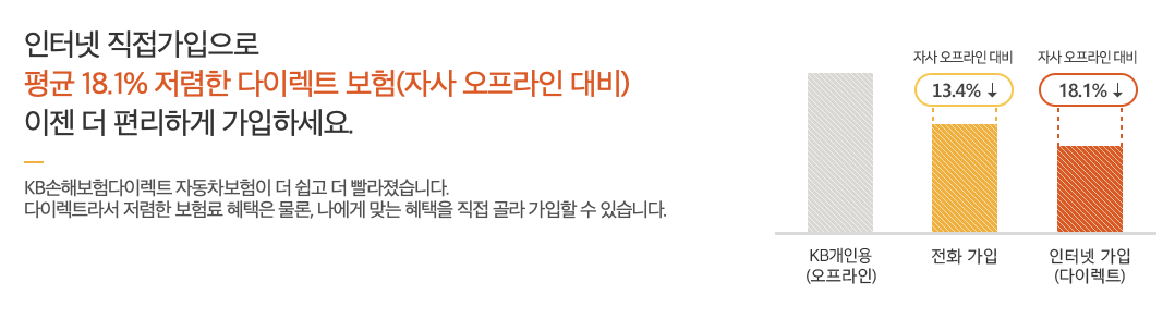 KB다이렉트는 인터넷 보험의 선두주자로서, 고객들에게 저렴하고 다양하고 편리한 보험서비스를 제공하고 있습니다. 지금 바로 KB다이렉트에 가입하시고, 보험료 할인 혜택을 누리세요!