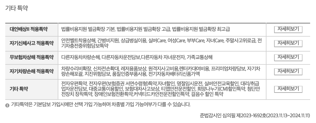 - 다양한 보장 옵션: 기본적인 자기신체사고, 차량손해, 책임보상 외에도, 도난, 화재, 침수, 동물충돌 등에 대한 보장 옵션을 선택할 수 있습니다. 또한, 고객의 요구에 따라 특약을 추가하거나 삭제할 수 있습니다.