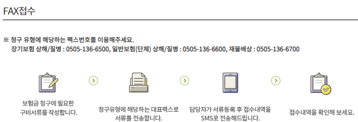 상담원과의 전화연결 없이 작성된 보험금 청구서와 관련 구비서류를 FAX접수 번호로 보내주시면 서류접수 후 접수번호 및 보상담당자 정보를 SMS로 전송해드립니다. 이후 보상과 관련한 사항은 보상담당자에게 문의하시면 됩니다.