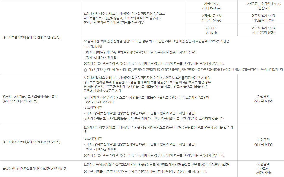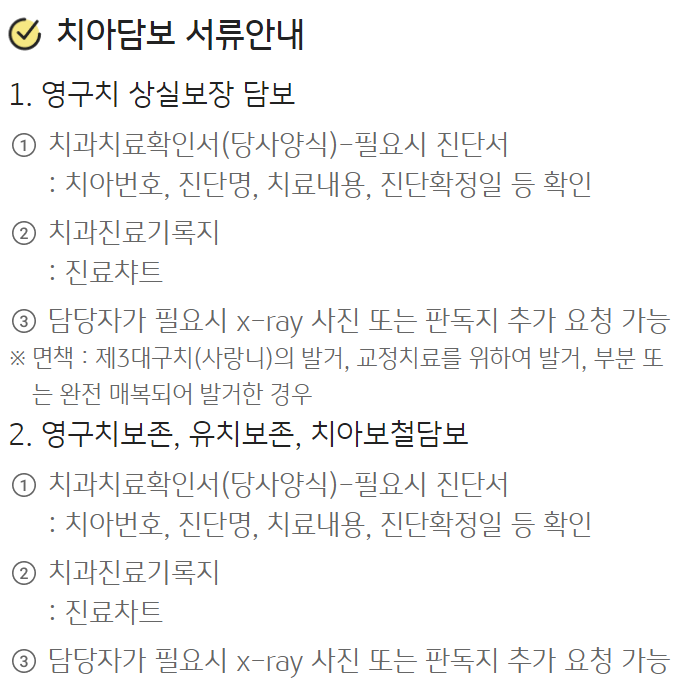 | 영구치상실치료비 | - 진료비계산서(병원/약국영수증) - 진료비상세내역서(비급여 내역이 없는 경우 생략가능) - 치과 치료에 관한 진료기록 사본(예시: 초진차트) - 진단서 - 치과치료확인서(당사양식) - 치료전후의 치아 X-RAY(파라노마사진 포함) 사진 또는 그 준하는 판독결과지 |