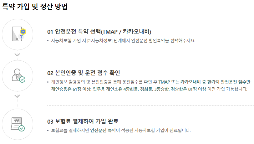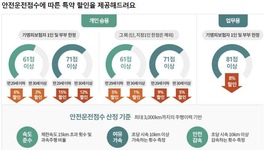 - 가입대상 : 직전 6개월 이내의 1,000km 이상 주행하여 산출된 안전운전점수가 61점 이상(개인 승용) 또는 81점 이상(업무용 개인 소유 4종화물,경화물,3종승합,경승합)인 고객님