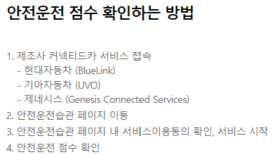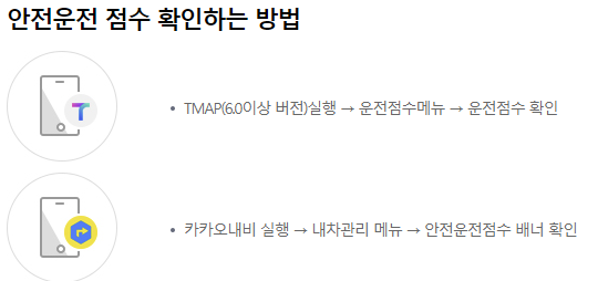 - 90일간 운행기록이 있을 수 없는 신차 등의 경우, 점수 확인일 기준 최근 1,000km 운행기록을 기반으로 산정함