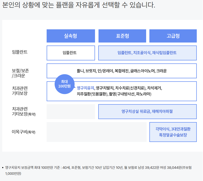 | 영구치유지 보험금 | 영구치가 단 한 개도 상실되지 않고 보험기간이 끝날때까지 살아있을 경우 [단, 최초계약의 계약일(갱신계약의 경우 갱신일) 현재 피보험자가 90세 이상인 경우는 제외] | 100만원 |