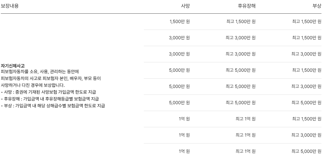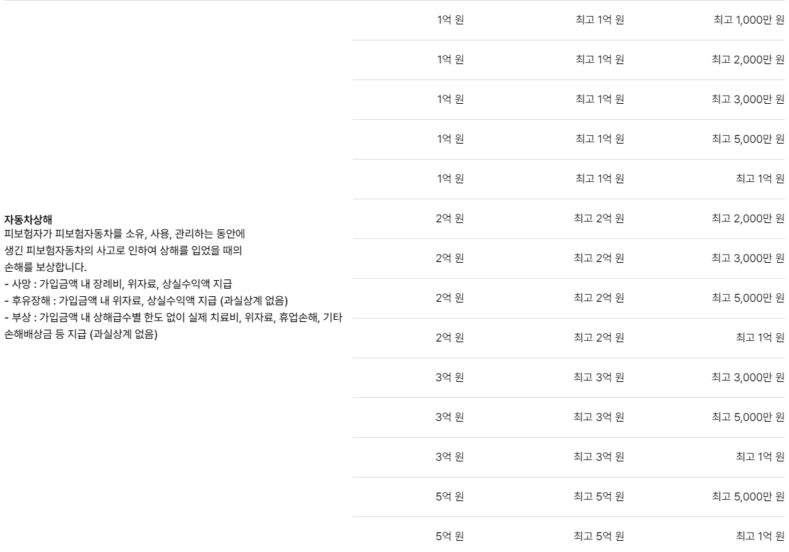 - 피해자 1인당 가입금액이며, 사망보험금 최저 지급액은 2,000만 원 입니다.