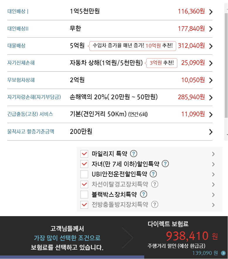 * 업무용 승합1,2종, 화물1,2,3종, 건설기계, 특수작업용/특정용도자동차는 5억 원, 10억 원을 가입하실 수 없습니다.