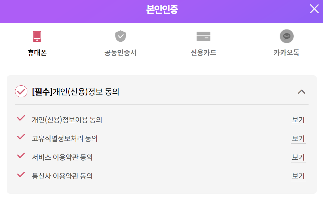 이름, 주민번호, 휴대폰 번호 입력 후 개인정보 수집 이용 동의를 클릭합니다.