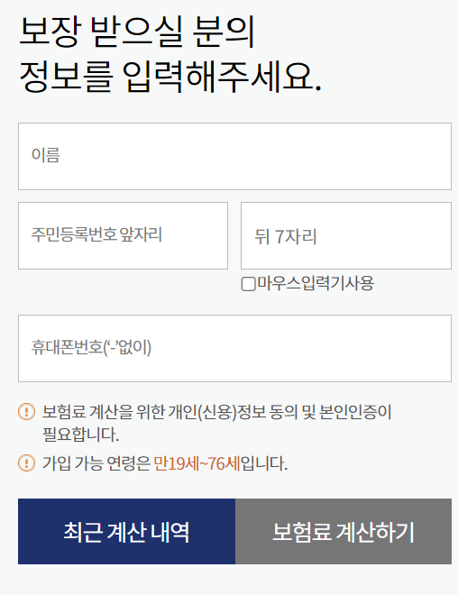 이름, 주민번호, 휴대폰 번호 입력 후 보험료 계산을 클릭합니다.