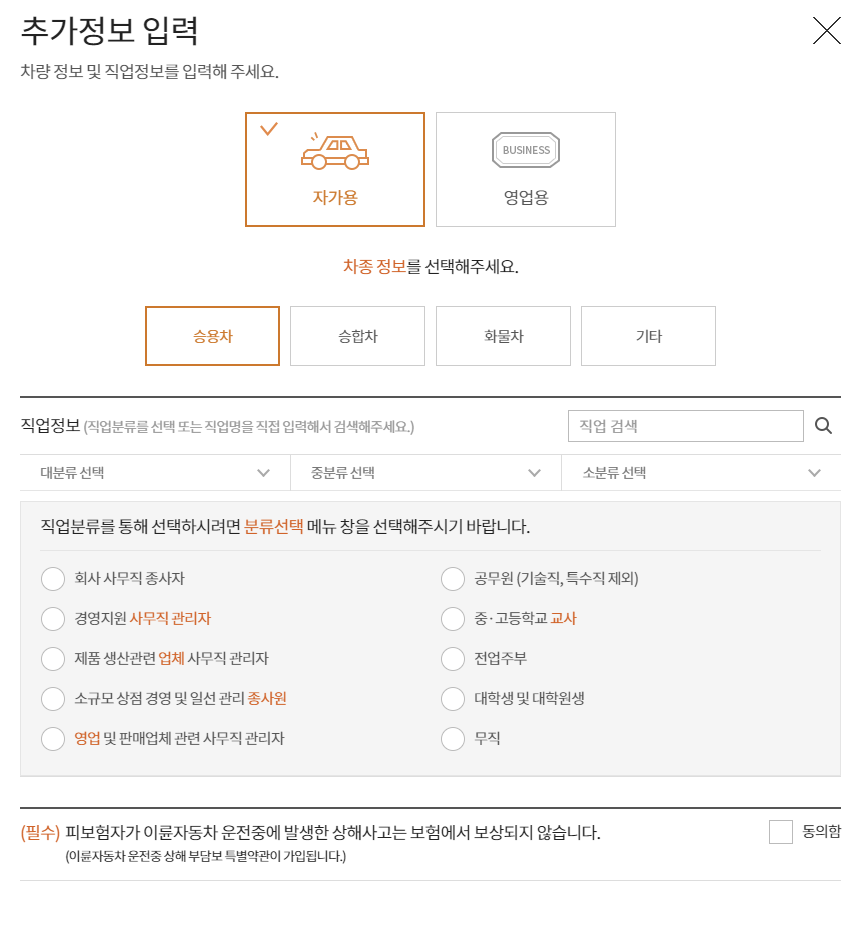 자동차 정보 및 직업정보를 입력해 주세요.