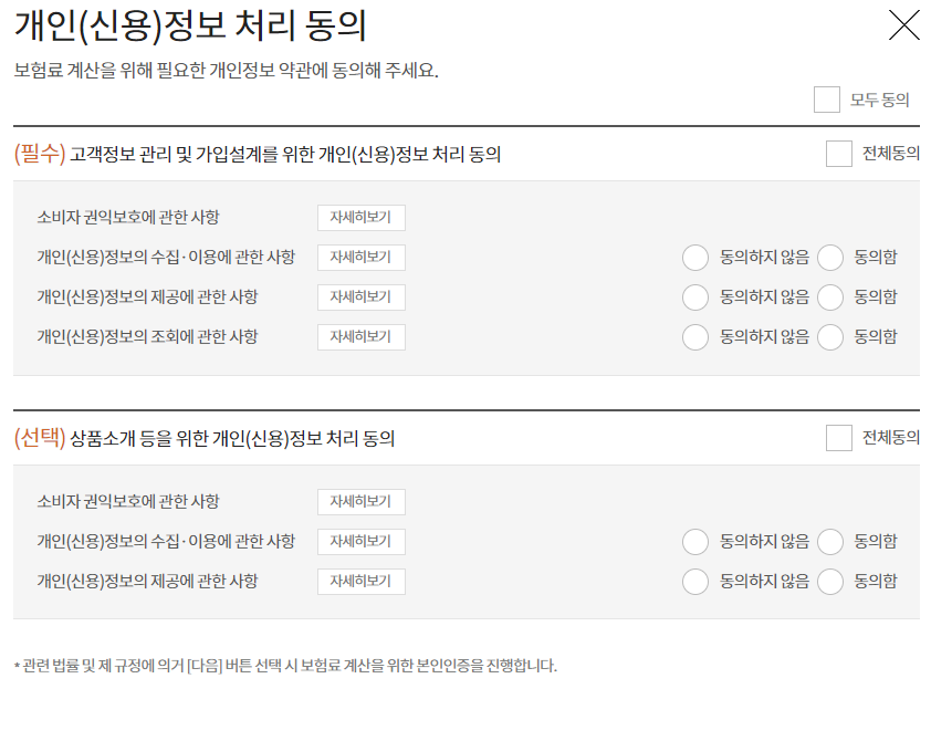 보험료 계산을 위해 필요한 개인정보 약관에 동의해 주세요. 선택약관은 동의 하지 않으셔도 됩니다.