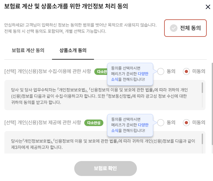 그 다음 보험료 계산을 위한 개인정보 처리에 동의를 합니다.