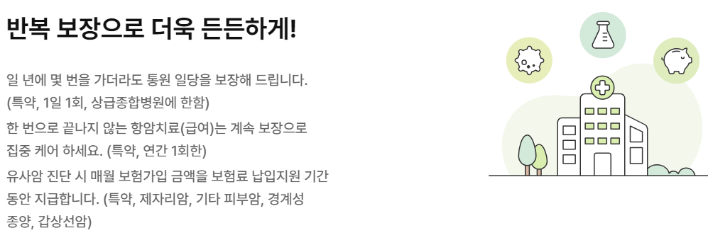 | 갱신형 암직접치료 통원일당 (상급종합병원) | 암보장개시일 이후 암으로 진단 확정되거나 보험기간 중에 유사암으로 진단 확정되고, 암 등의 질병의 직접적인 치료를 목적으로 상급종합병원에 통원하였을 경우 (1일 통원당 1회 한도, 통원 1회당) |