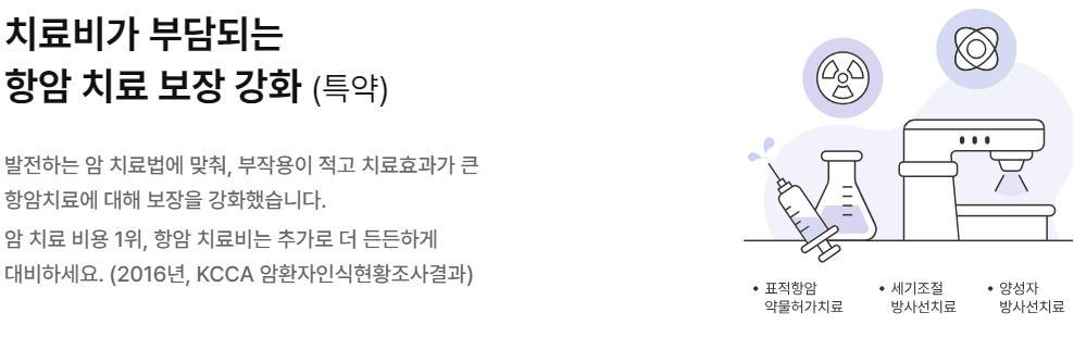 | 갱신형 계속 받는 항암방사선 약물치료비 (급여)(연간 1회한) | 암 보장개시일 이후 암으로 진단 확정되고 그 치료를 직접적인 목적으로 급여 항암방사선, 급여 항암 약물치료 시 (연간 1회한) |