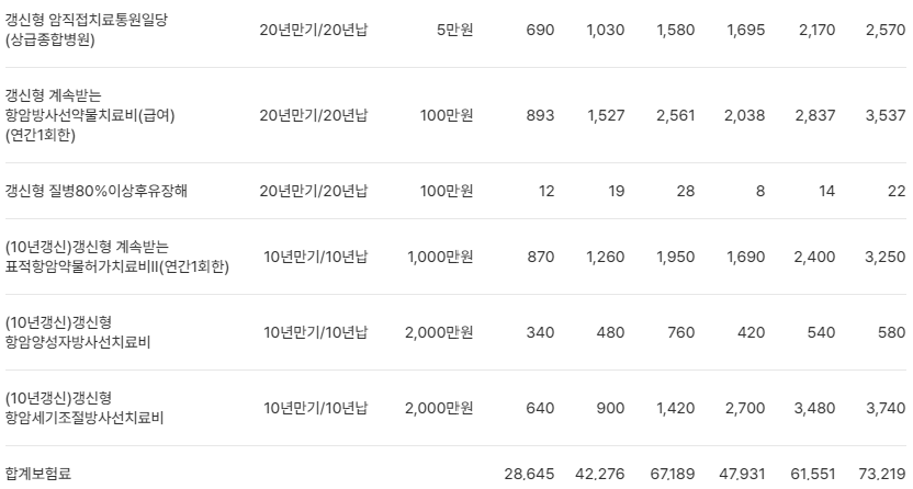 | 갱신형 계속받는 표적항암 허가치료비(연간1회)(10년 갱신) | 암보장개시일 이후 암으로 진단 확정되거나 보험기간 중에 기타피부암 또는 갑상선암으로 진단 확정되고 그 치료를 직접적인 목적으로 표적 항암약물허가 치료를 받는 경우 (연간 1회한) - 1년이내 치료시 가입금액의 50% 보장 |