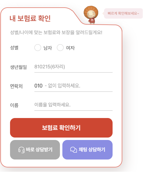 보험료 조회방법은 간단합니다. 먼저 성별, 생년월일, 연락처, 이름을 입력하고 보험료 확인하기를 클릭합니다.