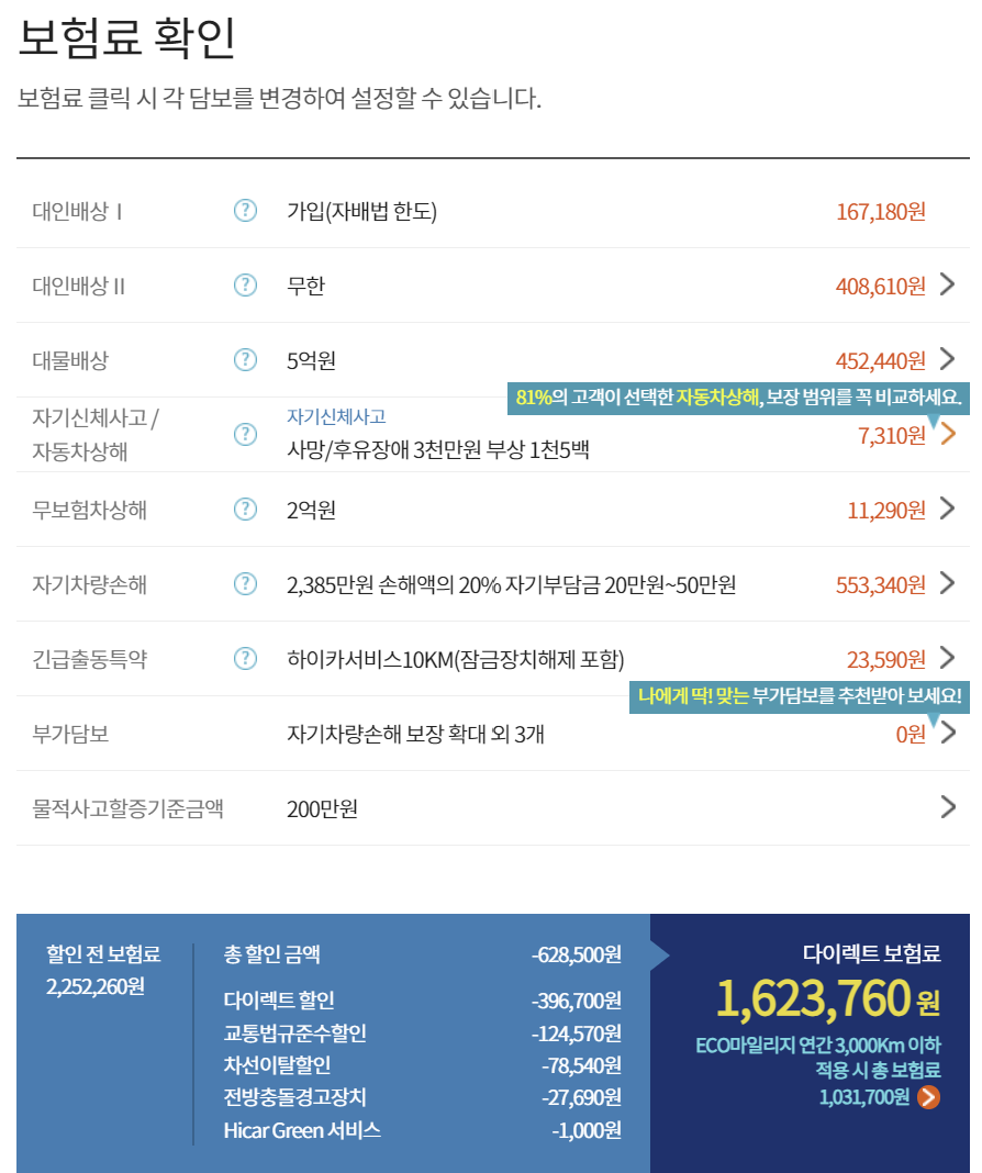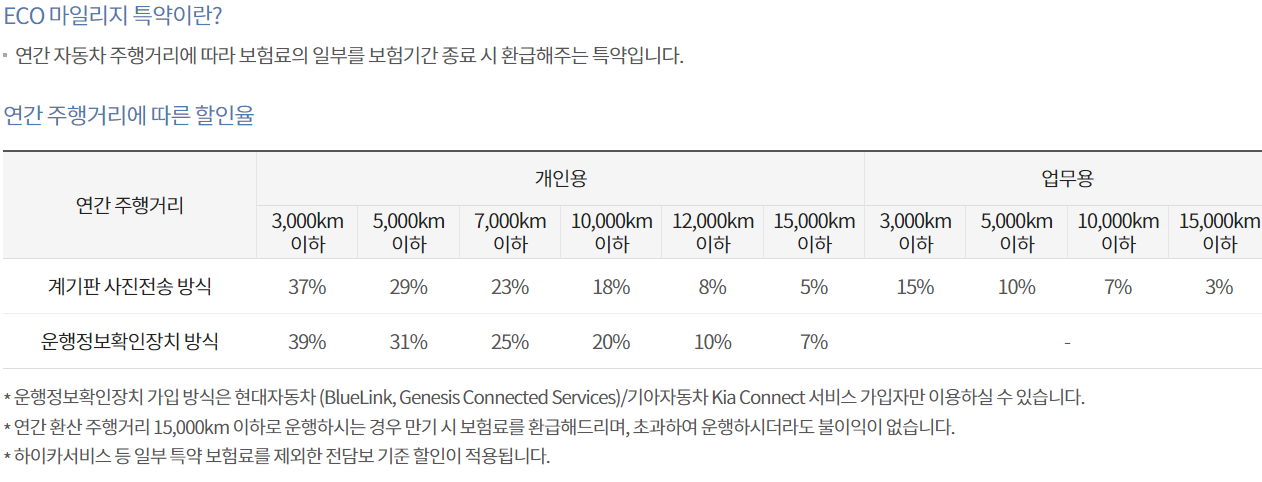 특히 ECO 마일리지 연간 3,000KM이하 적용 시 총 보험료가 많이 줄어드므로 한번 참고 하시기 바랍니다.
