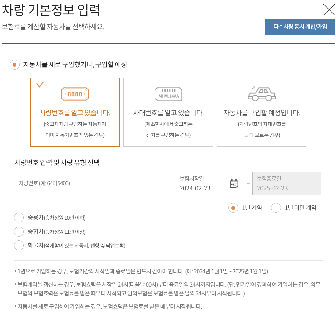 - 차량연식은 차량등록일(최초 신규등록일)상의 연도와 책임개시일의 연도(보험책임시작연도)의 차로 계산합니다.