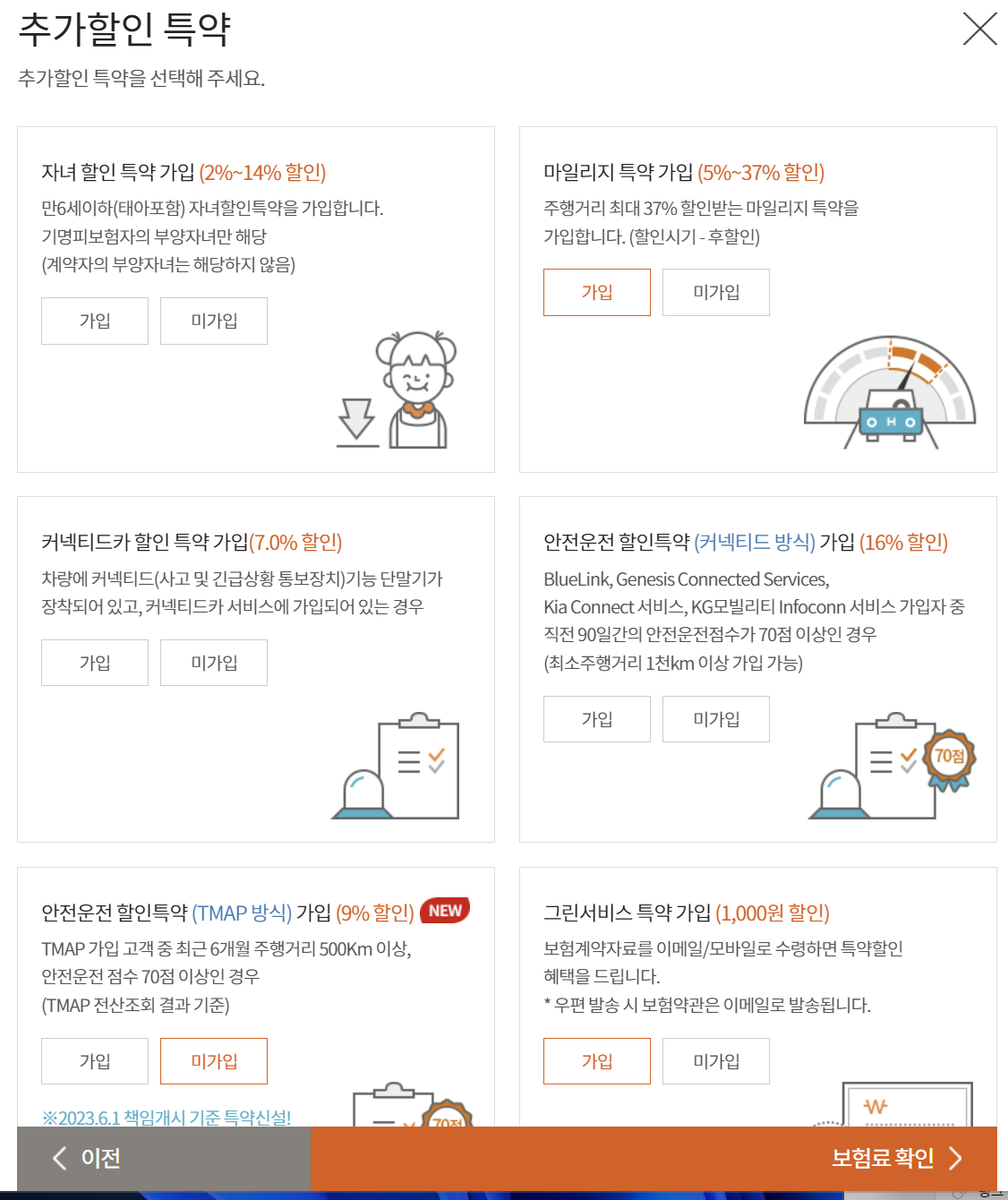 할인특약 적용이 가능한 특약이 있는 지 확인 후 가입, 미가입 체크하고 보험료 확인을 클릭하면 아래와 같이 보험료가 계산됩니다.